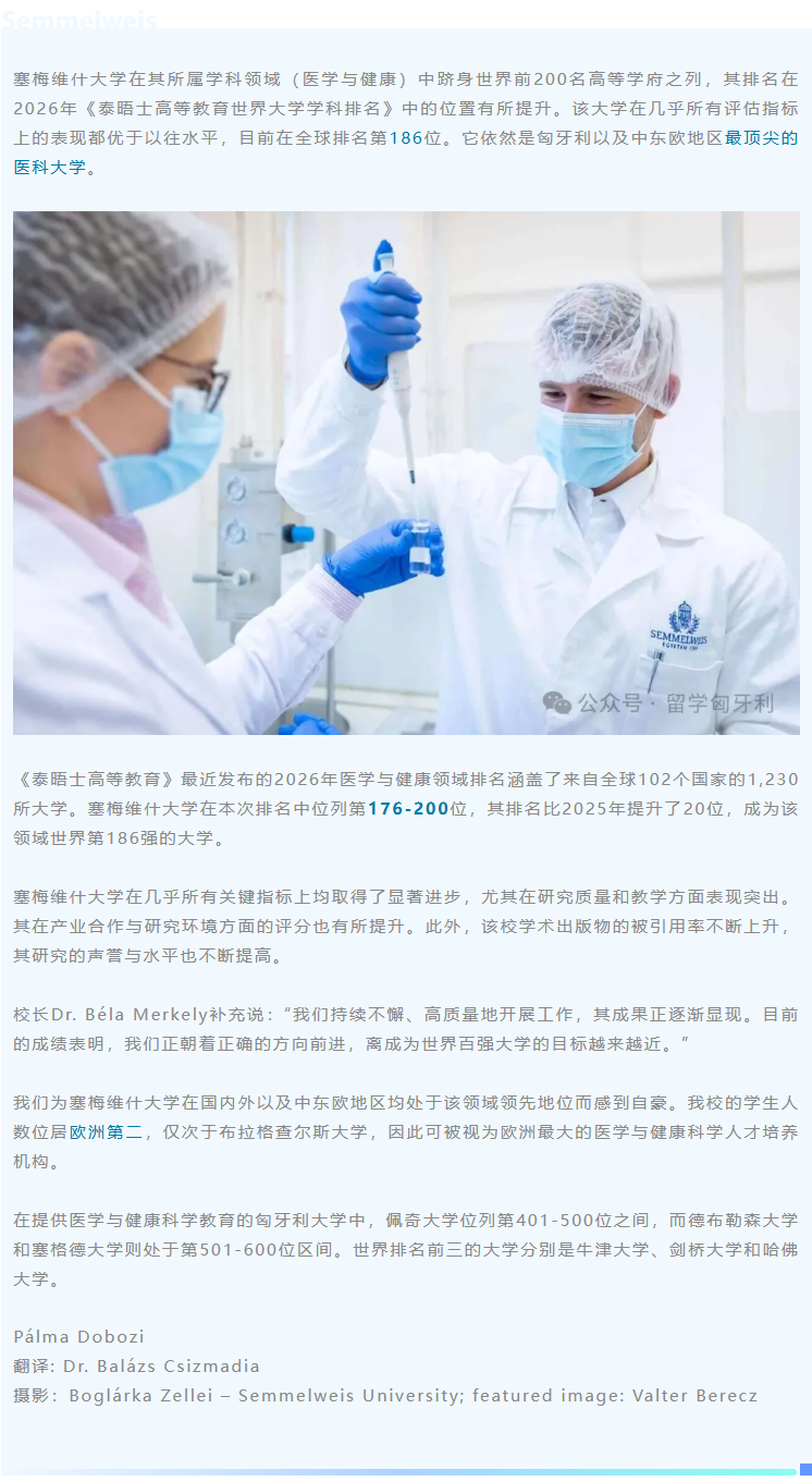 塞梅维什大学在医学与健康领域中位列世界前200名大学之列